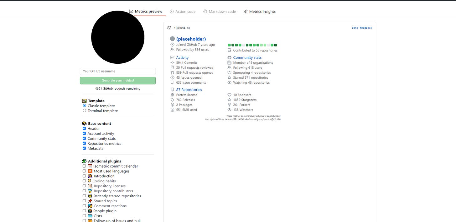 Generate your own metrics that can be embedded everywhere, including your GitHub profile readme! It works for both user and organization accounts, and even for repositories!