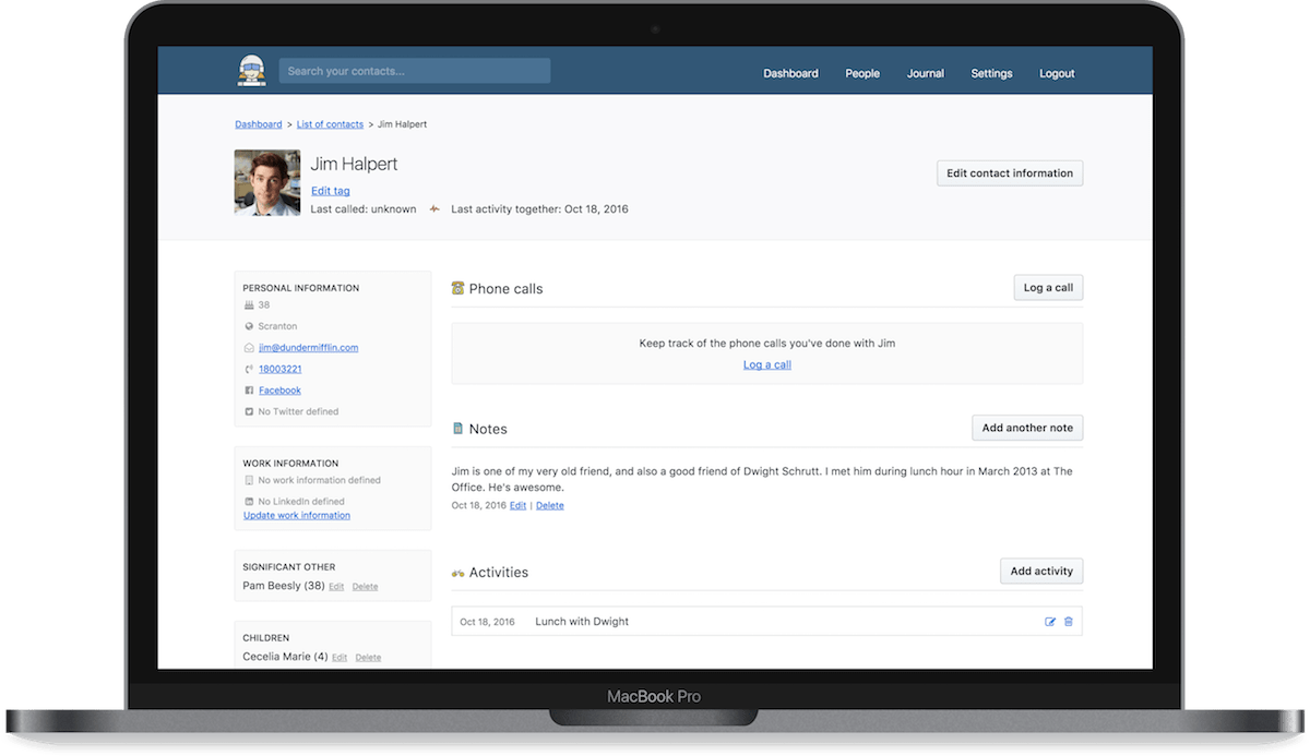 Monica is an open-source web application to organize and record your interactions with your loved ones. We call it a PRM, or Personal Relationship Management. Think of it as a CRM (a popular tool used by sales teams in the corporate world) for your friends or family.
